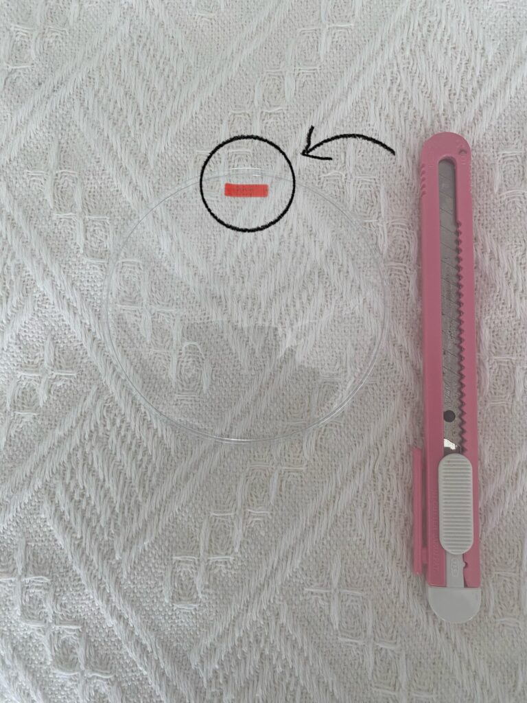 ①缶バッジカバーの上の方に1.6cmの切り込みをいれる。